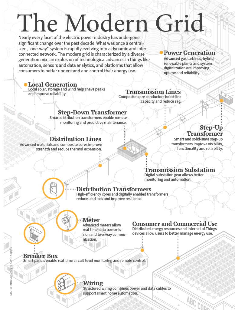 This graphic displays the parts of a modern grid from generation to the path to the home. MCREMC is a distribution cooperative and maintains and builds distribution lines only. (graphic available in larger format below)