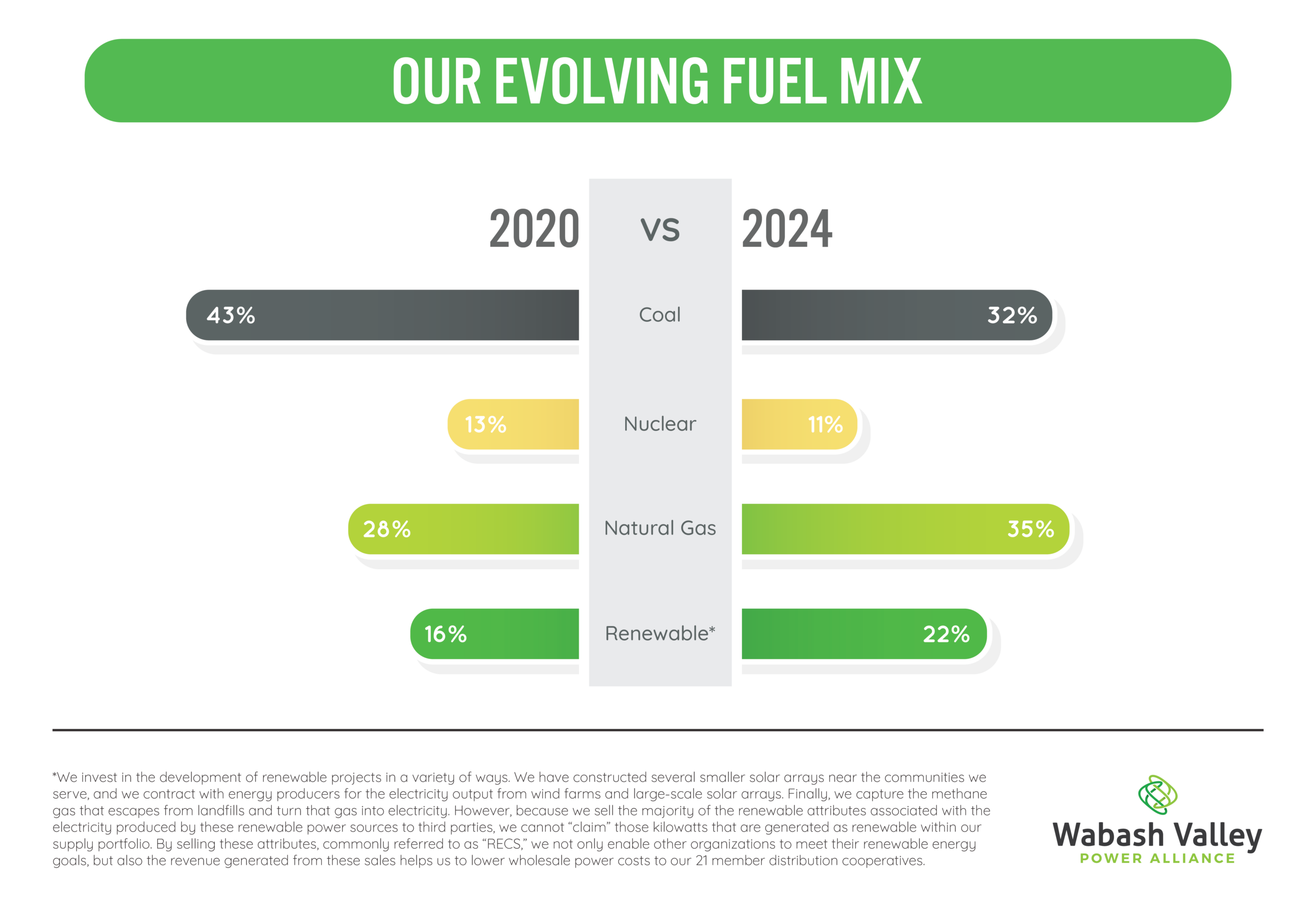 Marshall County REMC is a member-owned, not-for-profit electric cooperative. We do not generate electricity or own power plants, nor do we own high-voltage transmission lines. Instead, we purchase wholesale power through WVPA, which secures electricity from generation resources coordinated through MISO. That power is delivered to our substations and distributed to our members.