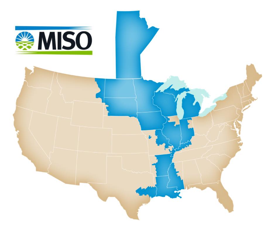 MISO is a regional grid operator responsible for balancing electricity supply and demand across portions of 15 states and the Canadian province of Manitoba.