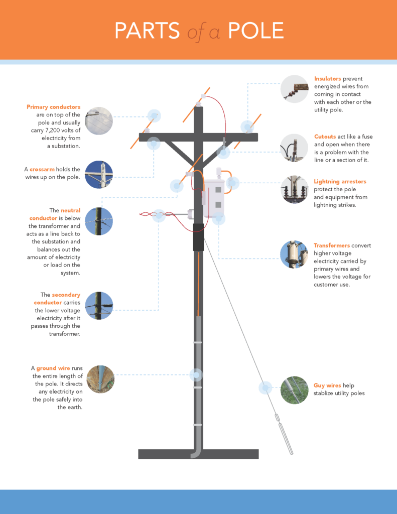 This graphic displays the parts of a distribution pole MCREMC has throughout our system. Distribution poles are different than transmission and generation. (graphic available in larger format below)